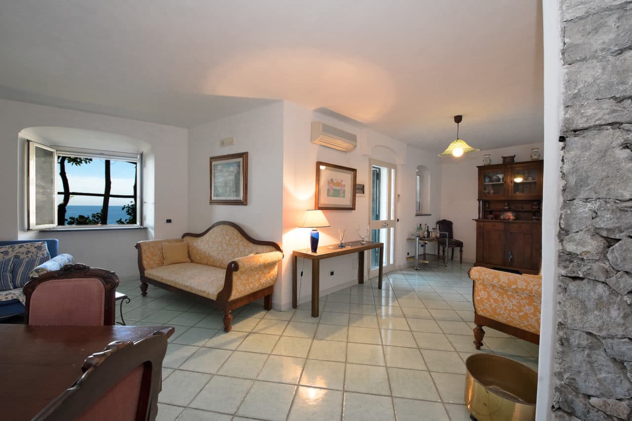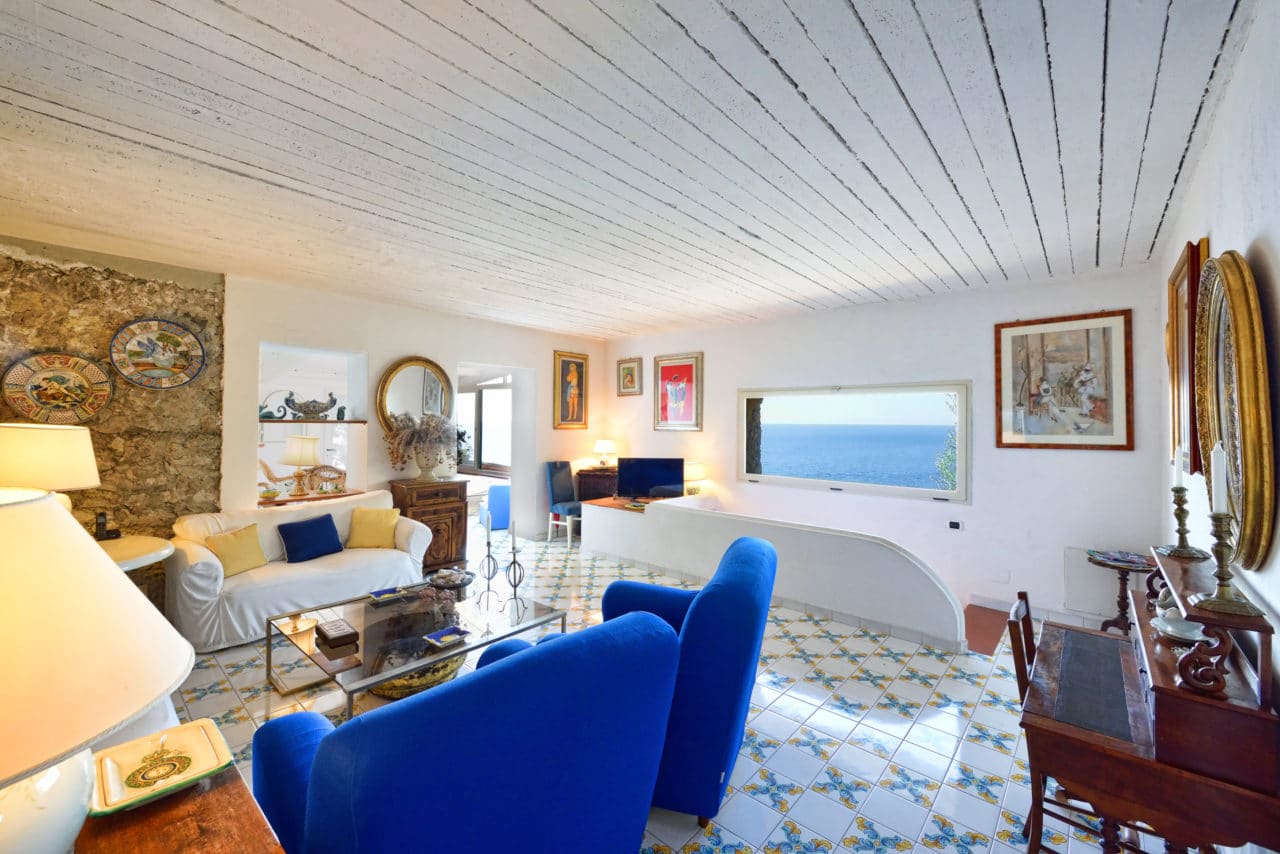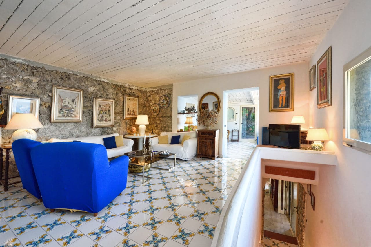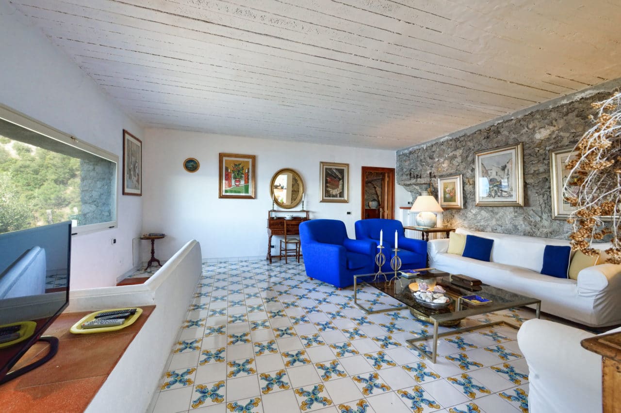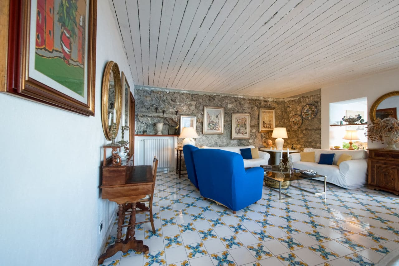 On the first floor there is another large living room with sofas and with sea view, living room has a floor of handmade majolica tiles, in the characteristic style of the Amalfi Coast.