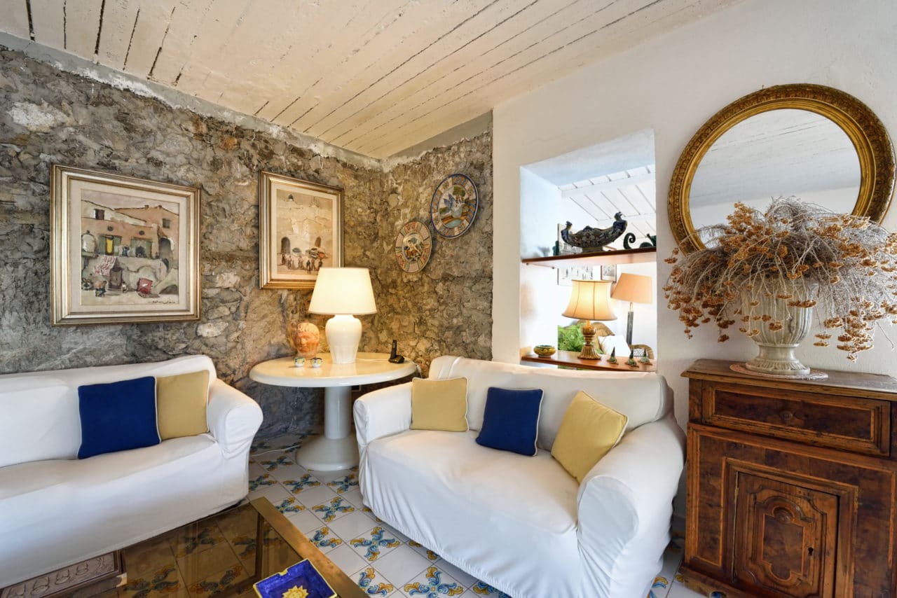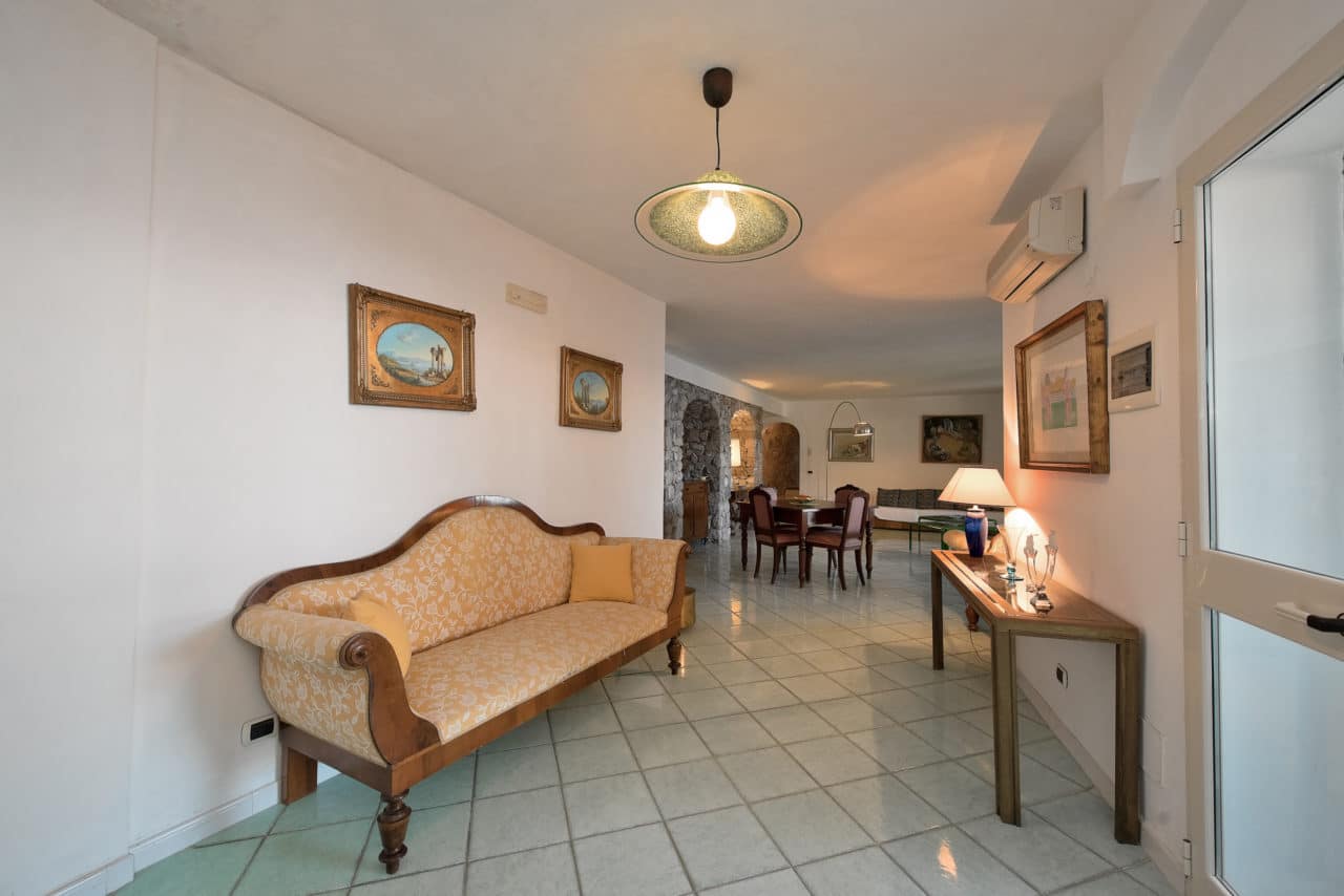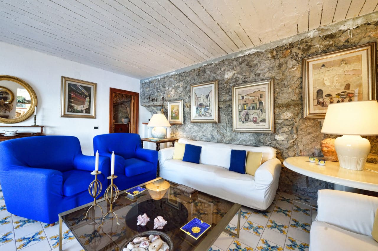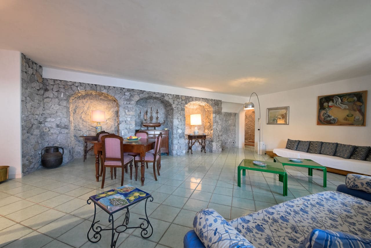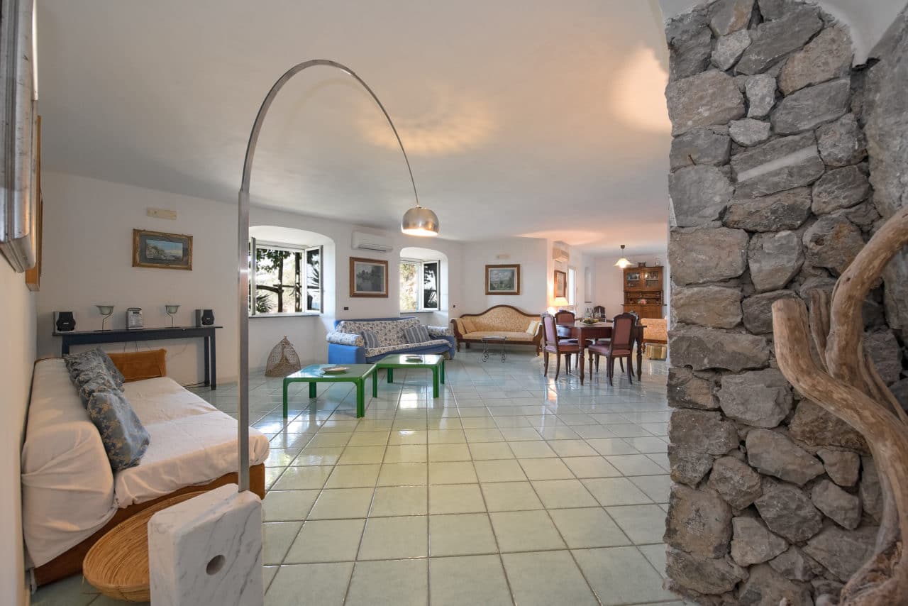 On the first floor there is another large living room with sofas and with sea view, living room has a floor of handmade majolica tiles, in the characteristic style of the Amalfi Coast.